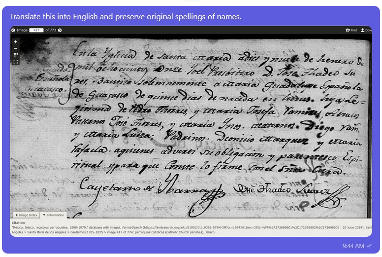 This is going to sound like a paid advertisement so delete right now if it gives any of you that type of flavor. I've heard that AI can assist with genealogical research and I think it really can. Now the example I've listed below was for a very simple transcription/translation but the possibilities are there. Also there is a free version but I'm used the $49/year version which gives you a limit on usage per day almost double the free version but it also gives you access to the more advanced ai versions. Basically I went to Poe.com and subscribed to the "starter" version which gives you 10,000 points to use per day (use or lose). I've understood that the below example only used a small amount of points but just use the free version for simple examples. I simply asked it to translate the uploaded document (attached below) into English and preserve the original spellings of names and got the below. For us beginners who have limited Spanish this might be the or one of the tools to use:
